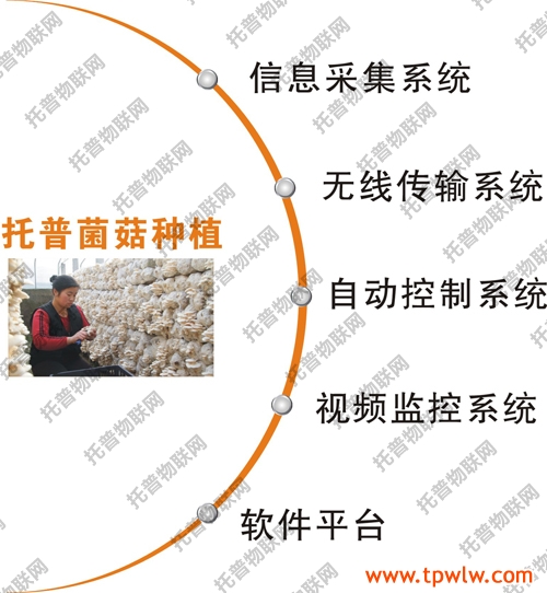 托普菌菇種植包括五大系統(tǒng):1.信息采集系統(tǒng)—可采集空氣溫濕度、土壤溫濕度、光照強(qiáng)度、二氧化碳強(qiáng)度等參數(shù);2.無線傳輸系統(tǒng)—可遠(yuǎn)程無線傳輸數(shù)據(jù);3.自動控制系統(tǒng)—包括噴灌、卷簾、風(fēng)機(jī)、加熱、補光等,達(dá)到作物適合生長環(huán)境;4.視頻監(jiān)控系統(tǒng)—查看作物實時生長情況、病蟲害防治和自動監(jiān)控功能;5.軟件平臺---遠(yuǎn)程數(shù)據(jù)實時查看參數(shù)和自動控制功能,各類報警功能等。