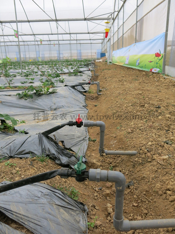 ??? 進(jìn)入二次結(jié)果后,一些草莓出現(xiàn)脫肥現(xiàn)象。此時(shí)如果不加強(qiáng)養(yǎng)分供應(yīng),容易影響到二茬果的產(chǎn)量和品質(zhì)。而且花期又不適宜經(jīng)常噴施葉面施肥,為施肥增加了一定的難度。運(yùn)用托普云農(nóng)水肥一體化滴灌技術(shù),將相應(yīng)階段的有機(jī)肥溶于水中配成溶液,通過埋在土壤下的管道施肥,并在大棚內(nèi)施放二氧化碳?xì)夥剩行岣吖夂献饔?,及時(shí)補(bǔ)充草莓所需的大量多元微量元素。