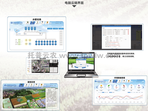?????? 基地安裝的托普云農(nóng)的溫室小管家、空氣溫濕度、光照強(qiáng)度、二氧化碳、土壤溫濕度、智能水肥裝置、視頻監(jiān)控系統(tǒng)等智能硬件可遠(yuǎn)程在線(xiàn)實(shí)時(shí)采集溫室環(huán)境信息,上傳至托普智慧農(nóng)業(yè)云平臺(tái),在管理平臺(tái)設(shè)置環(huán)境上下限值即可實(shí)現(xiàn)預(yù)警,定制的托普智慧農(nóng)業(yè)管理平臺(tái)通過(guò)手機(jī)或電腦可遠(yuǎn)程自動(dòng)開(kāi)啟相關(guān)的通風(fēng)、濕簾、灌溉等設(shè)備,查看環(huán)境數(shù)據(jù)、視頻信息、遠(yuǎn)程進(jìn)行專(zhuān)家咨詢(xún)、查看作物生長(zhǎng)情況、設(shè)備運(yùn)行狀況、園區(qū)安防情況等。實(shí)現(xiàn)溫室大棚的信息化、智能化、簡(jiǎn)約化管理。真正做到手機(jī)、電腦在手,管理無(wú)憂(yōu)。