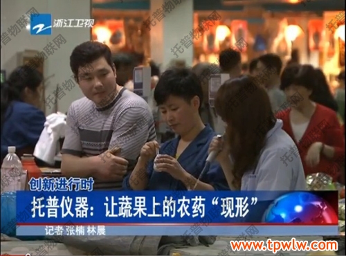 2013年5月22日晚,浙江新聞聯(lián)播報(bào)道了杭州市萬壽亭農(nóng)貿(mào)市場(chǎng)一位用農(nóng)藥殘留速測(cè)儀檢測(cè)自己所賣蔬菜的攤主以及農(nóng)藥殘留速測(cè)儀的研發(fā)及生產(chǎn)廠家——浙江托普儀器有限公司。
