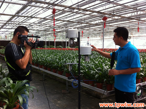 記者:所謂物聯(lián)網(wǎng),其實(shí)簡(jiǎn)單的說(shuō)就是物物相連,互相感知。大家看我身后的一組探頭(托普儀器固定式無(wú)線農(nóng)業(yè)氣象綜合監(jiān)測(cè)站),包括這個(gè)是測(cè)量溫度的,這個(gè)是測(cè)量土壤墑情的,上面還有測(cè)量二氧化碳濃度的,測(cè)量光照強(qiáng)度的。那這些測(cè)量數(shù)據(jù)都會(huì)上傳到我身后的中央控制室內(nèi)的計(jì)算機(jī)里,通過計(jì)算機(jī)的計(jì)算,再控制風(fēng)扇、噴灌…這些設(shè)備的運(yùn)轉(zhuǎn)。