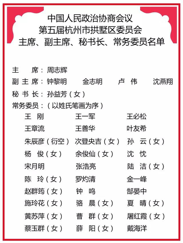 (2017年1月9日政協(xié)第四屆杭州市拱墅區(qū)委員會(huì)常務(wù)委員會(huì)第29次會(huì)議通過(guò))(以姓氏筆畫為序)