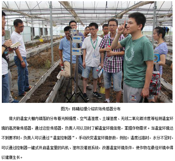 喬司農(nóng)場(chǎng)是浙江省首家集規(guī)模種植、科研生產(chǎn)、網(wǎng)絡(luò)銷售、宅配服務(wù)為一體的國(guó)家級(jí)農(nóng)業(yè)綜合開(kāi)發(fā)綠色蔬菜生產(chǎn)基地。2014年4月中旬,托普物聯(lián)網(wǎng)系統(tǒng)在喬司農(nóng)場(chǎng)成功搭建運(yùn)行。 隨后的8月2日,銷售部全體員工在時(shí)任營(yíng)銷經(jīng)理陳曦的帶領(lǐng)下前往喬司農(nóng)場(chǎng),觀看農(nóng)場(chǎng)內(nèi)的物聯(lián)網(wǎng)系統(tǒng)運(yùn)行情況。