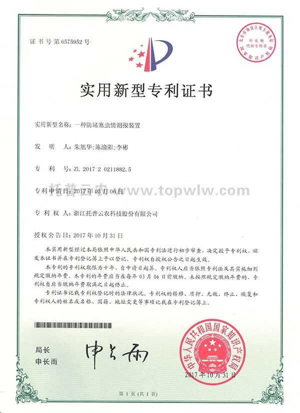 繼智能識別蟲情測報燈控制軟件獲得國家版權(quán)局軟件著作權(quán)后,托普云農(nóng)在蟲情測報領(lǐng)域再取得新突破。10月31日,由托普云農(nóng)研發(fā)的“一種防堵塞蟲情測報裝置”,獲得國家知識產(chǎn)權(quán)局實(shí)用新型專利授權(quán),授權(quán)專利號:ZL 2017 2 0211882.5。