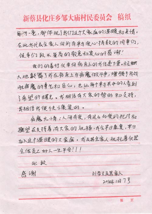 1月15日,公司收到劉學(xué)義寫來的信,信中他告訴托普家人他的病情已好轉(zhuǎn),術(shù)后已由重癥監(jiān)護室轉(zhuǎn)入普通病房,等待觀察與休養(yǎng)。長長的一封信,給同事們帶來了喜悅的消息,也傾訴著他對托普家人的深深謝意!