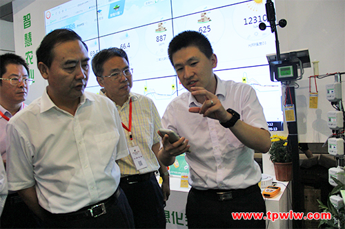 會議期間,安徽省農業(yè)委員會孫正東主任蒞臨托普云農農業(yè)物聯(lián)網展區(qū),并細致觀摩了托普云農所展出的大田“四情”監(jiān)控系統(tǒng)、設施農業(yè)監(jiān)控系統(tǒng)、土壤墑情監(jiān)控系統(tǒng)等多種農業(yè)物聯(lián)網綜合服務平臺,以及與之相關的多種儀器和智能硬件設備。在參觀過程之中,孫正東主任詳細詢問了大田“四情”監(jiān)控系統(tǒng)、遠程傳輸智能蟲情測報燈、植物本體傳感器、固定式無線農業(yè)氣象綜合監(jiān)測站等系統(tǒng)設備。陳曦經理為其一一進行介紹。