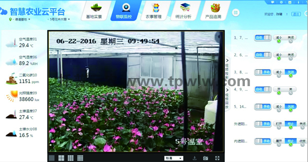 對(duì)于規(guī)模化的溫室大棚種植而言,單靠人工管理需要大量人手,耗力費(fèi)時(shí),并且存在難以避免的人工誤差。托普物聯(lián)網(wǎng)智能溫室控制系統(tǒng)采集溫室內(nèi)的空氣溫濕度、土壤水分、土壤溫度、二氧化碳、光照強(qiáng)度等實(shí)時(shí)環(huán)境數(shù)據(jù),通過(guò)中繼節(jié)點(diǎn)傳輸?shù)娇刂浦行模芍行钠脚_(tái)系統(tǒng)將最新監(jiān)測(cè)數(shù)據(jù)與預(yù)先設(shè)定適合農(nóng)作物生長(zhǎng)的環(huán)境參數(shù)與進(jìn)行比較,如發(fā)現(xiàn)傳感器監(jiān)測(cè)到的數(shù)據(jù)與預(yù)設(shè)數(shù)值有了偏差,計(jì)算機(jī)會(huì)自動(dòng)發(fā)出指令,智能啟動(dòng)與系統(tǒng)相連接的通風(fēng)機(jī)、遮陽(yáng)、卷被、加濕、澆灌等設(shè)備進(jìn)行工作,直到大棚內(nèi)環(huán)境數(shù)據(jù)達(dá)到系統(tǒng)預(yù)設(shè)的數(shù)據(jù)范圍之內(nèi),相關(guān)設(shè)備才會(huì)停止工作。