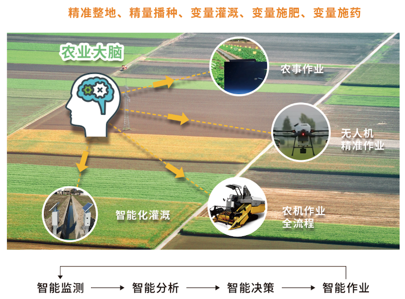 以北斗衛(wèi)星導航技術為基礎,結合智能農事建議,聯(lián)動智能裝備,實現(xiàn)大田生產全程作業(yè)機械化、管理可視化,農場無人化。